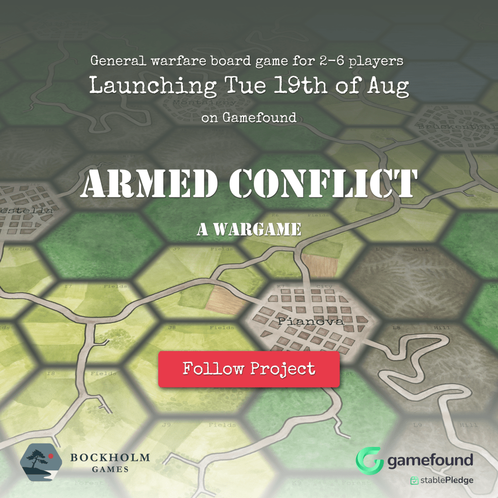 The crowdfunding campaign for Armed Conflict will Launch on Gamefound on Tuesday 19th of August at 9:00 UTC. Remember to follow the project on Gamefound before that to get a 5 euro discount.